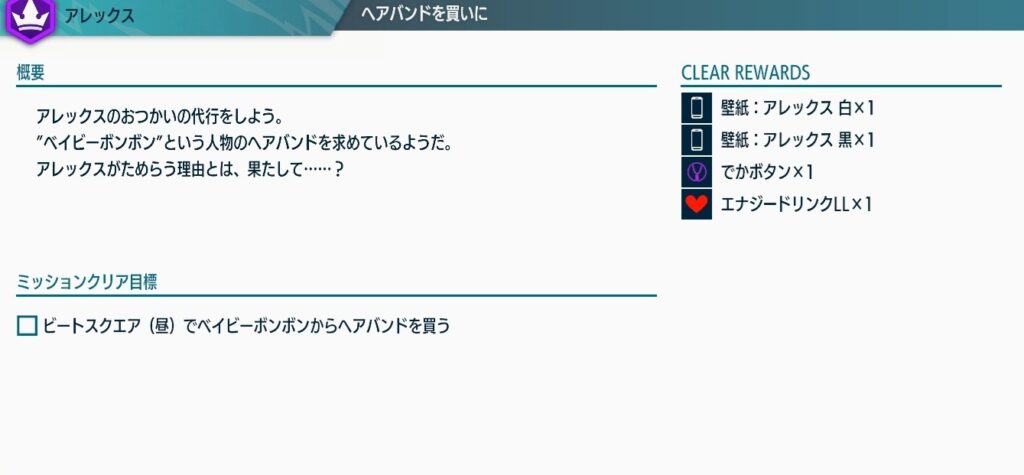 ・アレックスに話しかけ、ヘアバンドのお使いを頼まれる